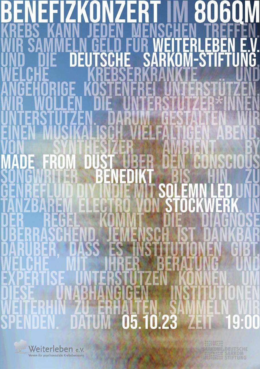 Wir sammeln Geld für Weiterleben e.V. und die deutsche Sarkom-Stiftung, welche Krebserkrankte und Angehörige kostenfrei unterstützen. Wir wollen die Unterstützer*innen unterstützen. Darum gestalten wir einen musikalisch vielfältigen Abend. Von Synthesizer Ambient by Made from Dust über den Conscious Songwriter Benedikt bis hin zu Genrefluid DIY Indie mit Solemn Led und tanzbarem Electro von Stockwerk.